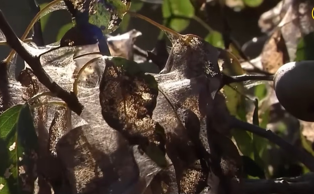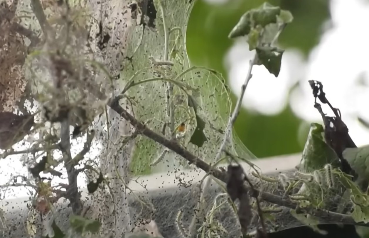 Как отмечалось в недавнем репортаже телеканала ОНТ, вредитель уже заметно изменил пейзажи юга страны — местами деревья опутаны паутиной, словно в тумане, а специалисты продолжают проводить обработку насаждений и удаление гнёзд.