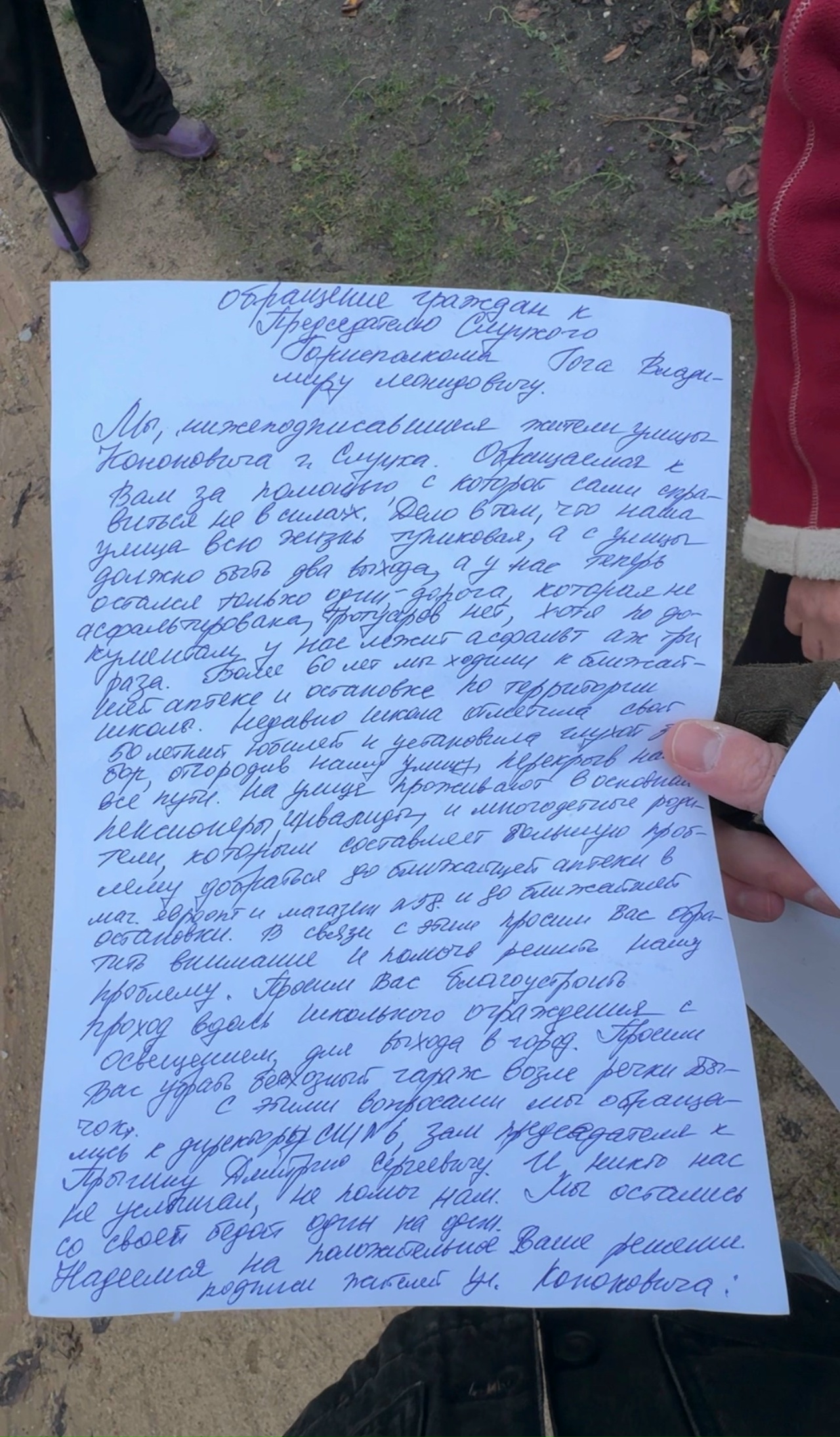 В обращении говорится: "Более 60 лет мы ходим к ближайшей аптеке и остановке по территории школы. [..] Просим вас благоустроить проход вдоль школьного ограждения с освещением для выхода в город". В конце автор обращения добавляет, что обращения к директору школы и в райисполком не принесли результатов.