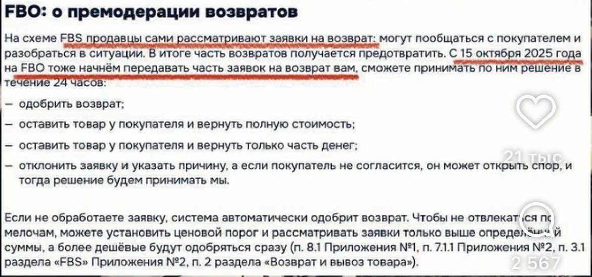 В одном из видео приводится скриншот, где действительно указано, что с 15 октября 2025 года продавцам на FBO начнут передавать часть заявок на возврат. Однако: