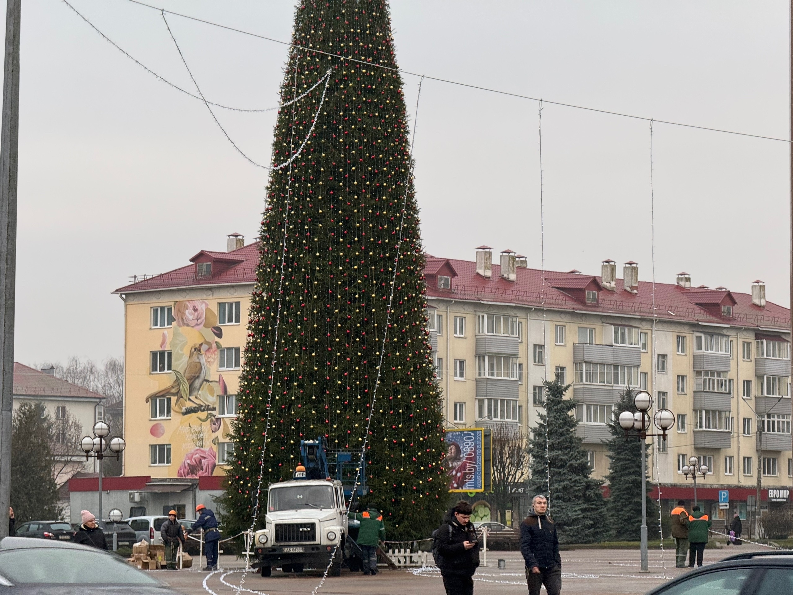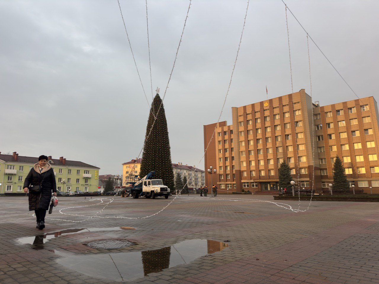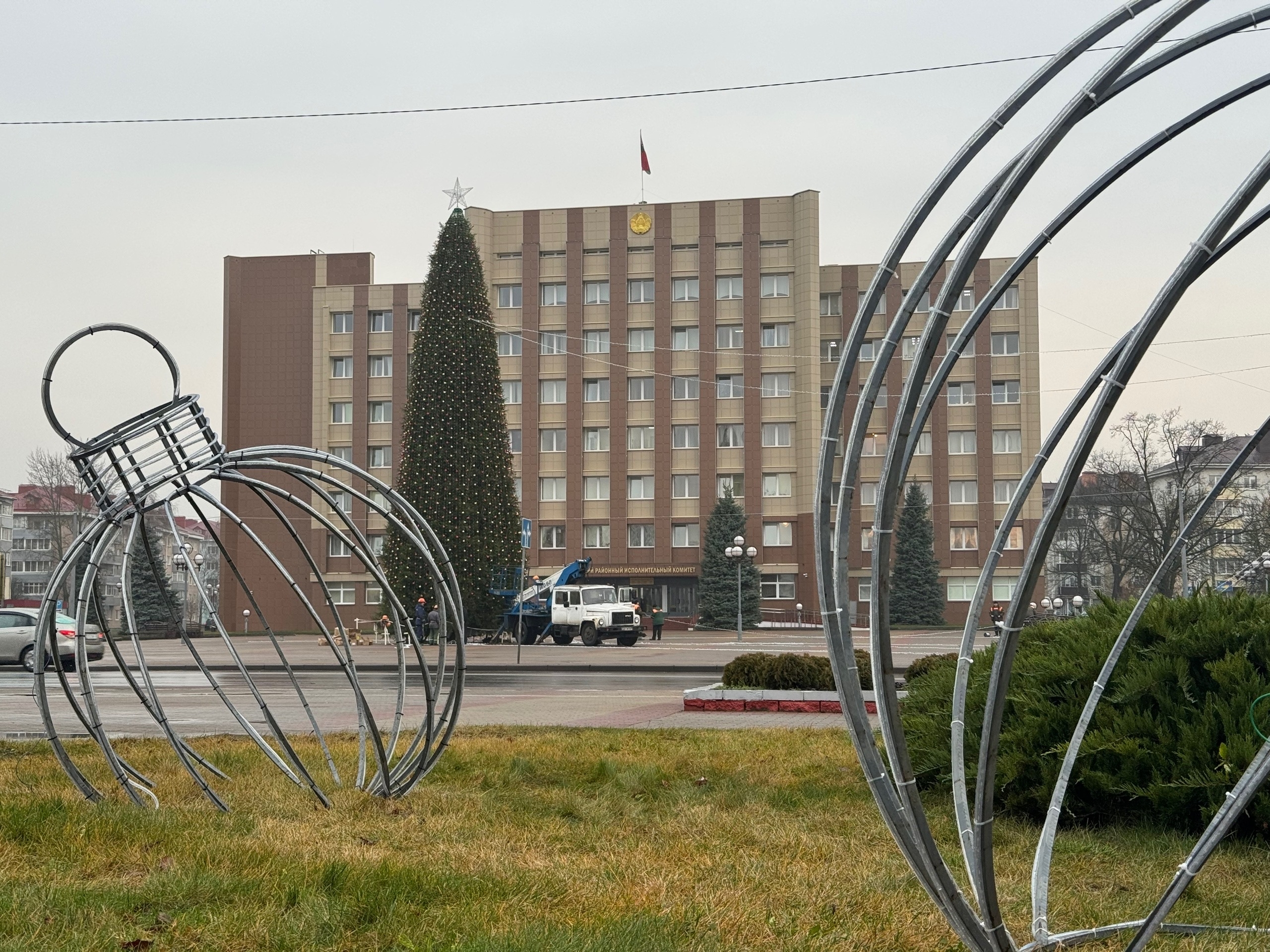 Центральную часть Слуцка начали украшать к Новому году. В этом году оформление города стало масштабнее — над площадью смонтируют световой купол «Звёздное небо».