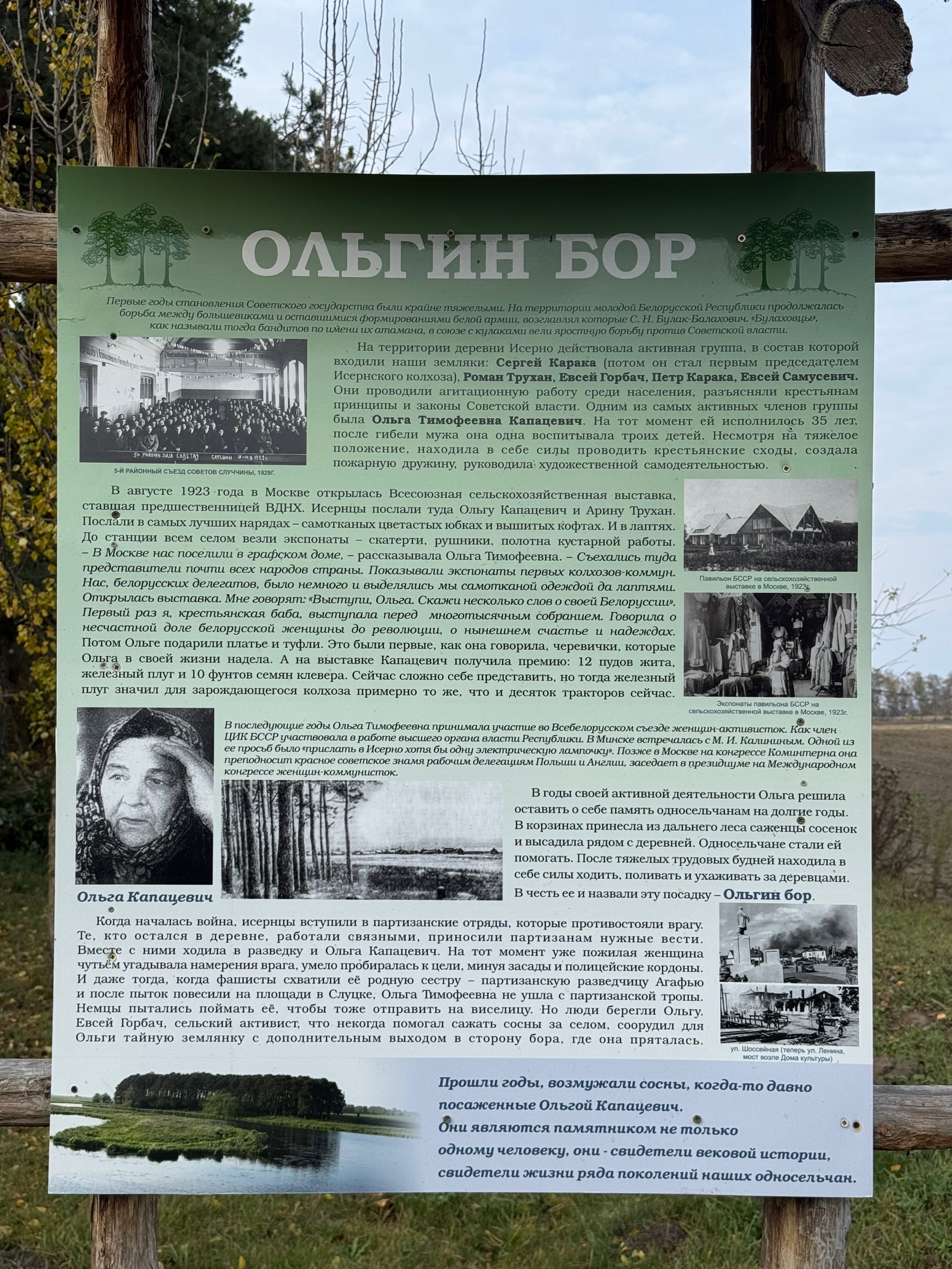«Прошли годы, возмужали сосны, когда-то давно посаженные Ольгой Капацевич. Они являются памятником не только одному человеку, они — они свидетели вековой истории и жизни многих поколений наших односельчан», — говорится на установленном стенде.