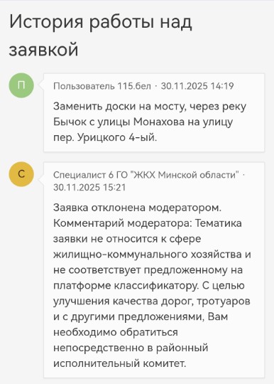 Мужчина сообщил о проблеме через платформу 115.бел, однако его обращение было отклонено. В ответе модератора указано, что «тематика заявки не относится к сфере ЖКХ и не соответствует классификатору», а для решения вопроса предложено обращаться напрямую в районный исполнительный комитет.