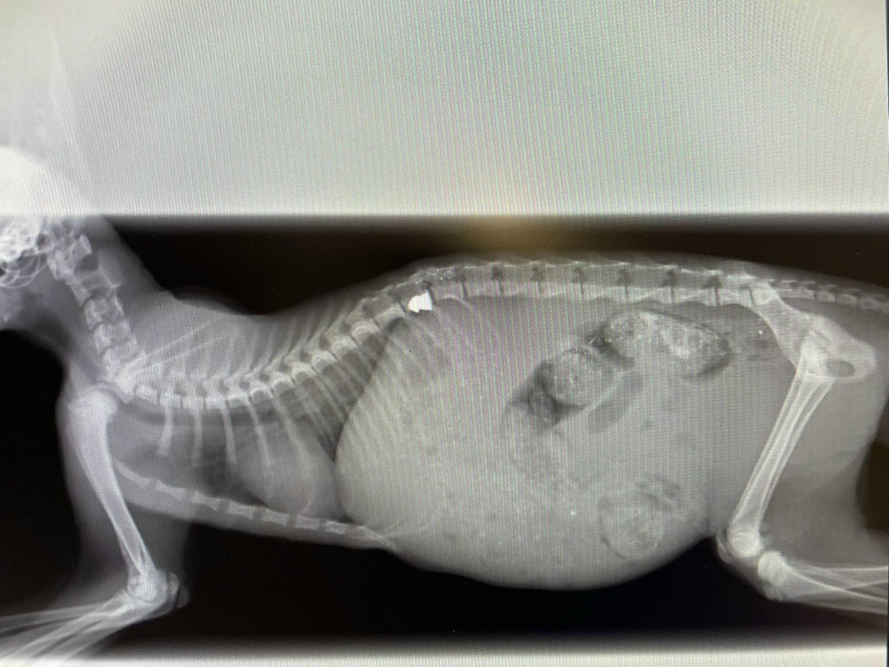 Специалисты ветклиники провели котёнку необходимую диагностику, включая МРТ, а также сделали операцию по извлечению пули. К несчастью, позвоночник был задет и повреждены нервные окончания, поэтому задние лапы животного отказали.