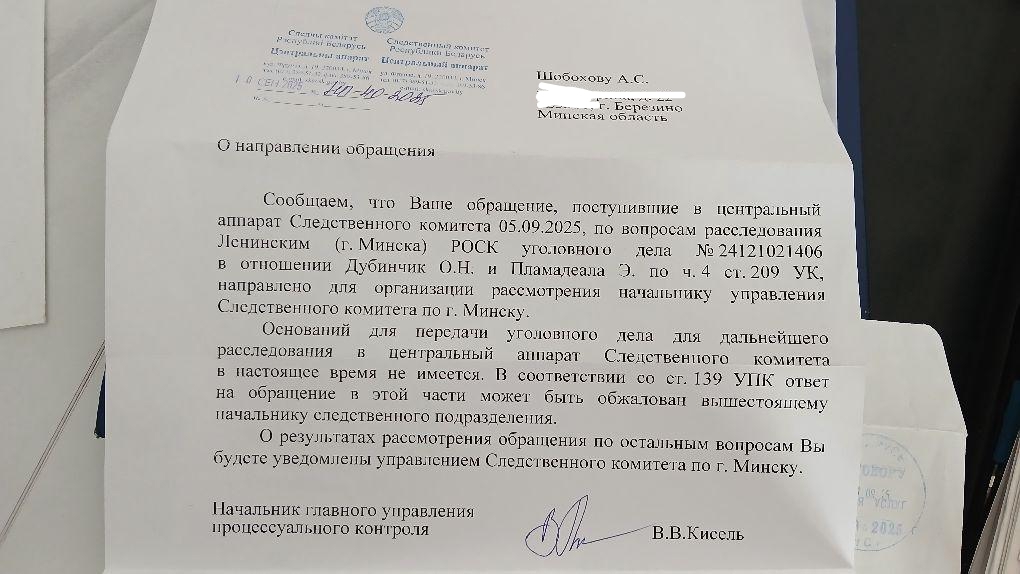 От других пострадавших узнали, что Ольга и Эдуард находятся под подпиской о невыезде, но с недавнего времени в группу «кидают» новый договор, заключённый с ними в августе 2025 года. После этого мы написали коллективное письмо председателю СК РБ генерал-майору юстиции Гора Д.Ю., но спустя время всем пришли одни и те же формальные ответы. Кстати, официально потерпевшими нас признали только 6 мая 2025 года, и на этом всё – дело приостановлено.