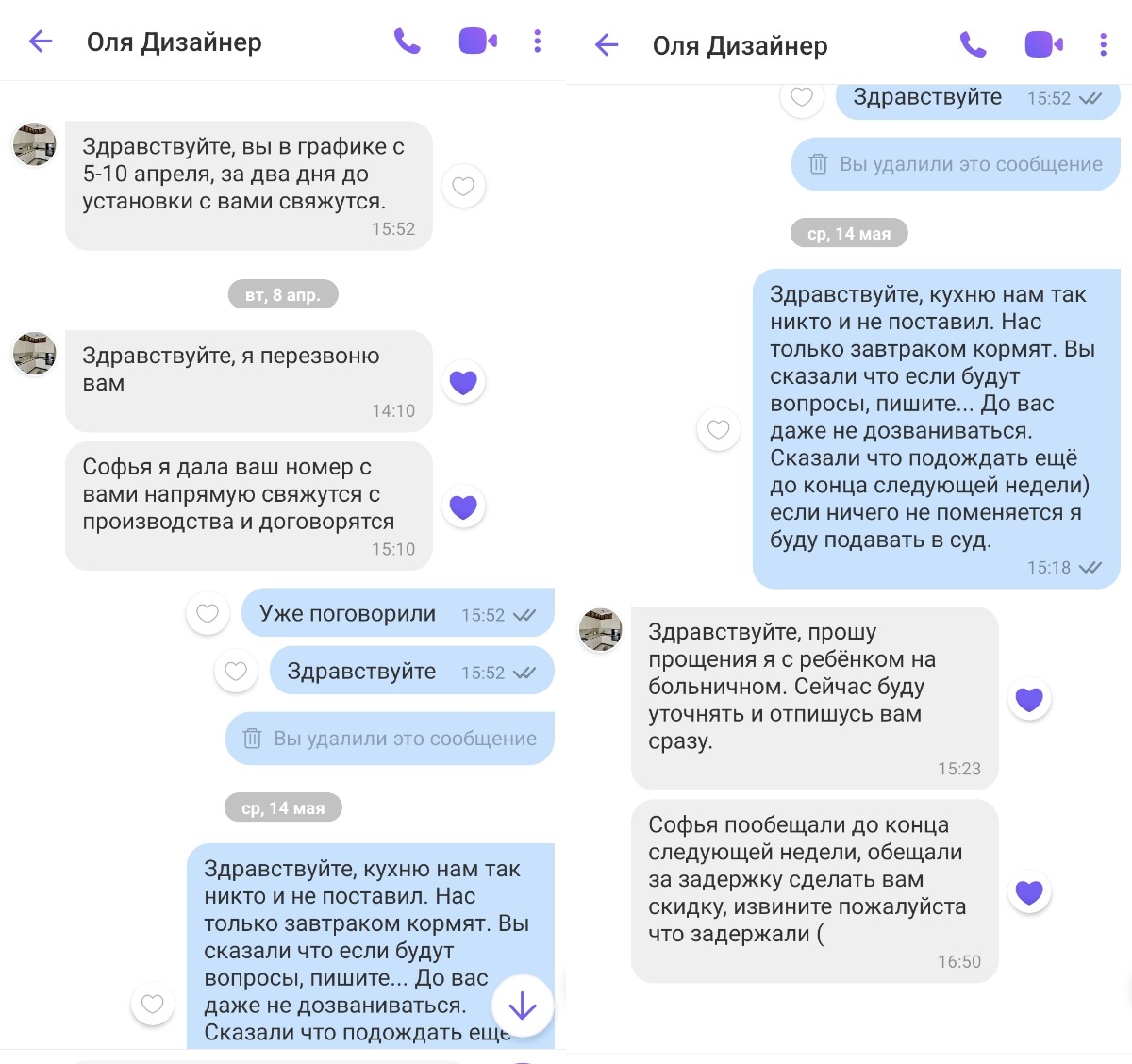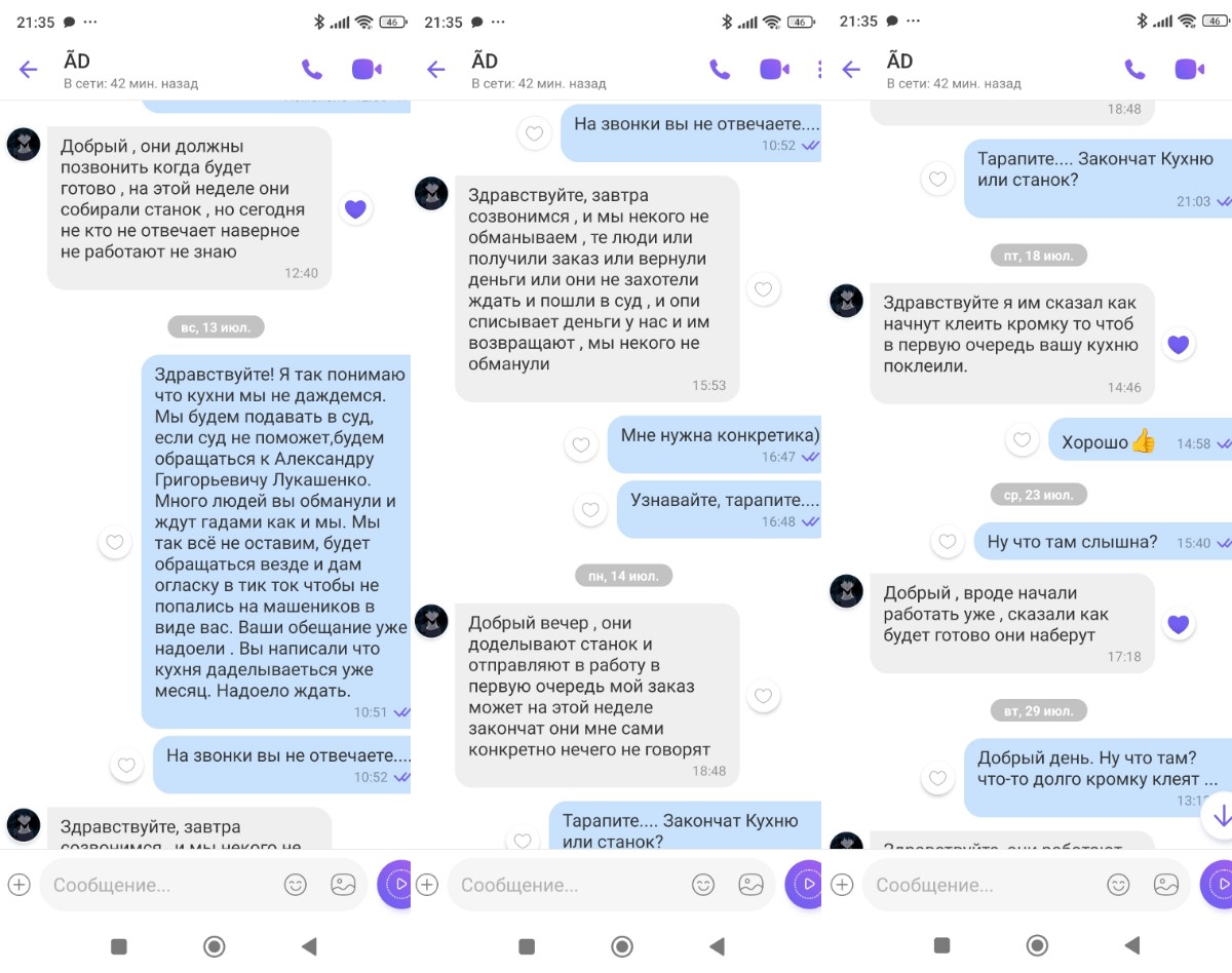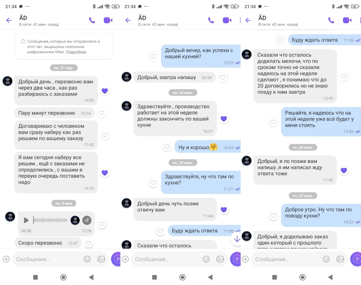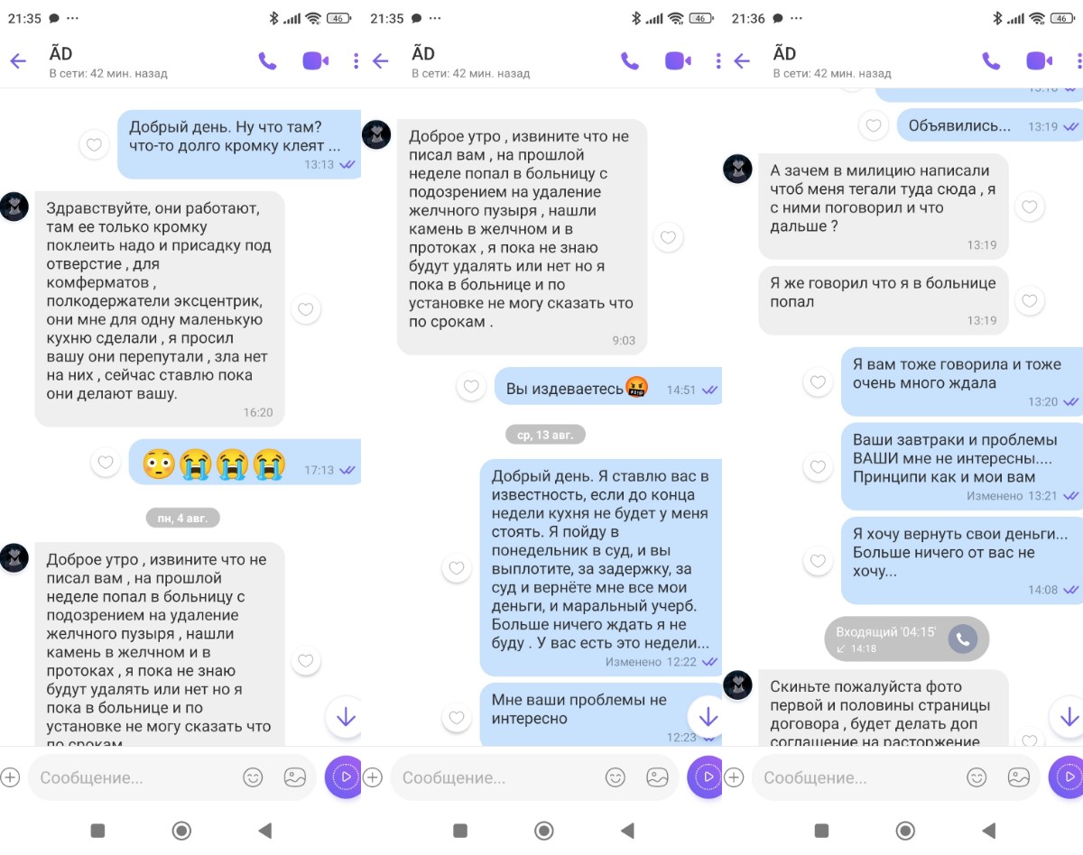 Как и в других случаях, за всё время связь с «кухонщиками» осуществлялась по телефону несколько раз. А ближе к окончанию срока с лидчанкой общались уже посредством мессенджера Vider. В одном из сообщений говорилось, что Ольга болеет, и все нюансы нужно уточнять у Эдуарда, однако он также ссылался на болезнь и почему-то не мог говорить с клиентом.