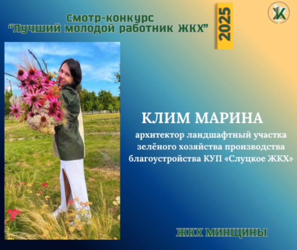 Серебряным призёром стала архитектор ландшафтного участка зелёного хозяйства производства благоустройства КУП «Слуцкое ЖКХ» Марина Клим. Она — единственная участница от Слуцкого района, вошедшая в тройку сильнейших, и показала высокий уровень подготовки. На церемонии награждения (на фото — в центре) она получила диплом и цветы.