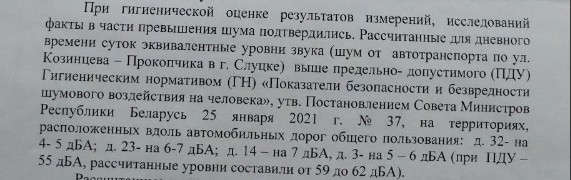 На часть вопросов жители уже получили официальные ответы. По информации Слуцкого зонального центра гигиены и эпидемиологии, проведённые в сентябре 2025 года замеры показали превышение предельно допустимых значений. В официальном ответе говорится: «Значения эквивалентного уровня звука составили 59,6 и 62 дБА при допустимом уровне — 55 дБА». Также зафиксировано превышение по загрязнению воздуха, что подтверждено протоколом от 6 октября 2025 года.