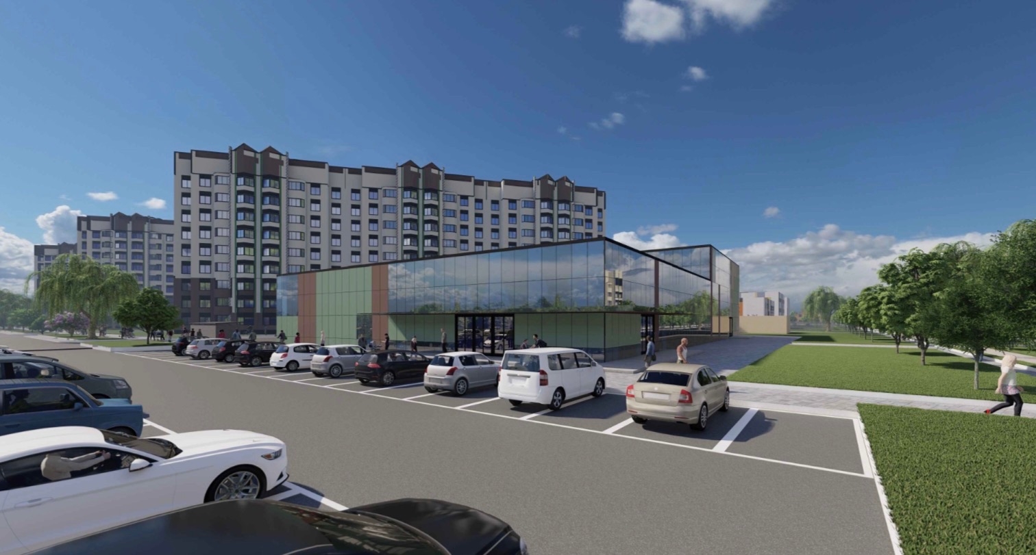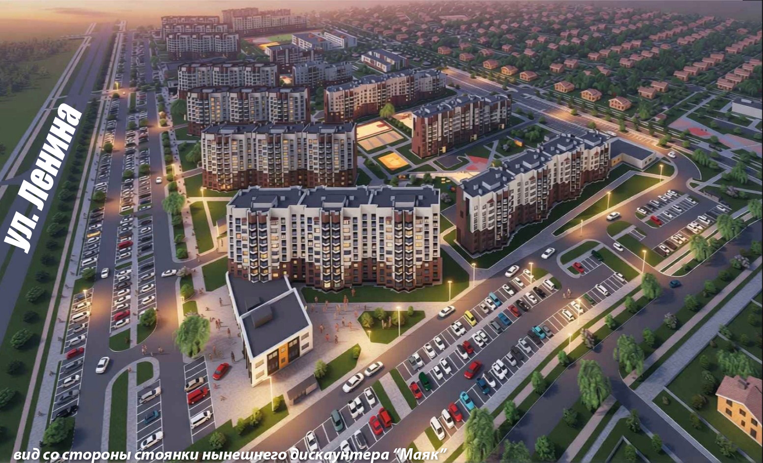 Ниже — торговый центр на углу между улицами Ленина новой улицей, разделяющей 1-ю и 2-ю очередь строительства (сам ТЦ отнесён ко 2-й очереди).