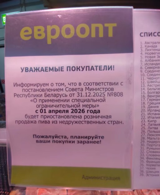 Основанием стало постановление Совета Министров Республики Беларусь от 31 декабря 2025 года №808 «О применении специальной ограничительной меры». Документ регулирует ввоз и реализацию отдельных товаров из стран, признанных недружественными.