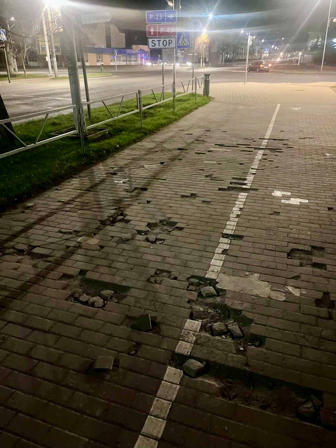 На снимке видно, что часть плитки сместилась, раскрошилась или вовсе отсутствует. Из-за этого поверхность стала неровной и может создавать неудобства при движении, особенно в темное время суток.