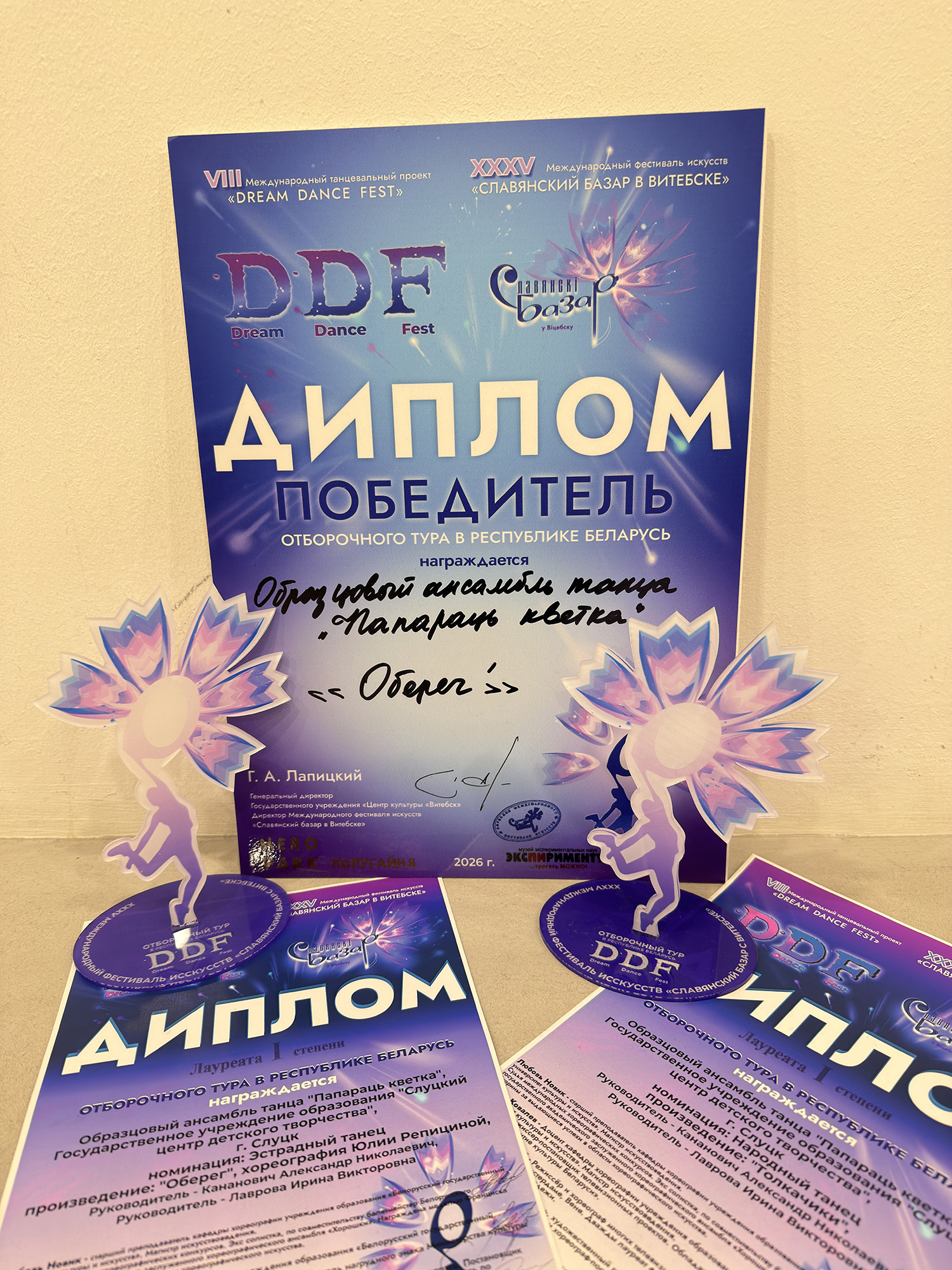 Диплом Лауреата I степени в номинации «Эстрадный танец» за номер «Оберег». Это постановка хореографа Юлии Репициной — лиричный, наполненный смыслом танец, который тронул и зрителей, и членов жюри. Показательно, что даже в эстрадном жанре «Папараць кветка» остаётся верна своим корням: «Оберег» пронизан народными мотивами и глубоким уважением к традиции.